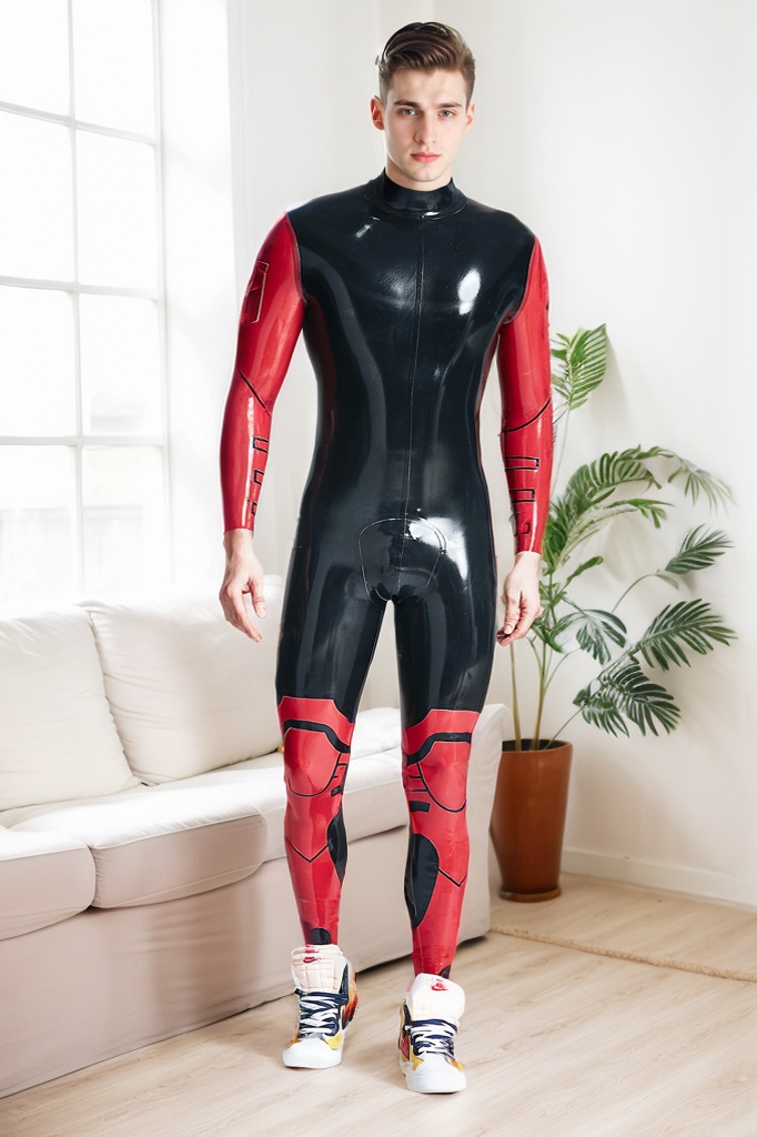 Material and Design: This catsuit is a commanding and rugged piece crafted from high-gloss genuine latex. The design features a bold Black main body with striking Red sleeves and lower legs, creating a powerful, high-tech look. The "Defender" suit is defined by its strategic contrast paneling, which includes a false armor pattern on the legs, giving it a strong, futuristic vibe. The glossy, reflective material perfectly conforms to the body, emphasizing the wearer's physique and muscle definition.