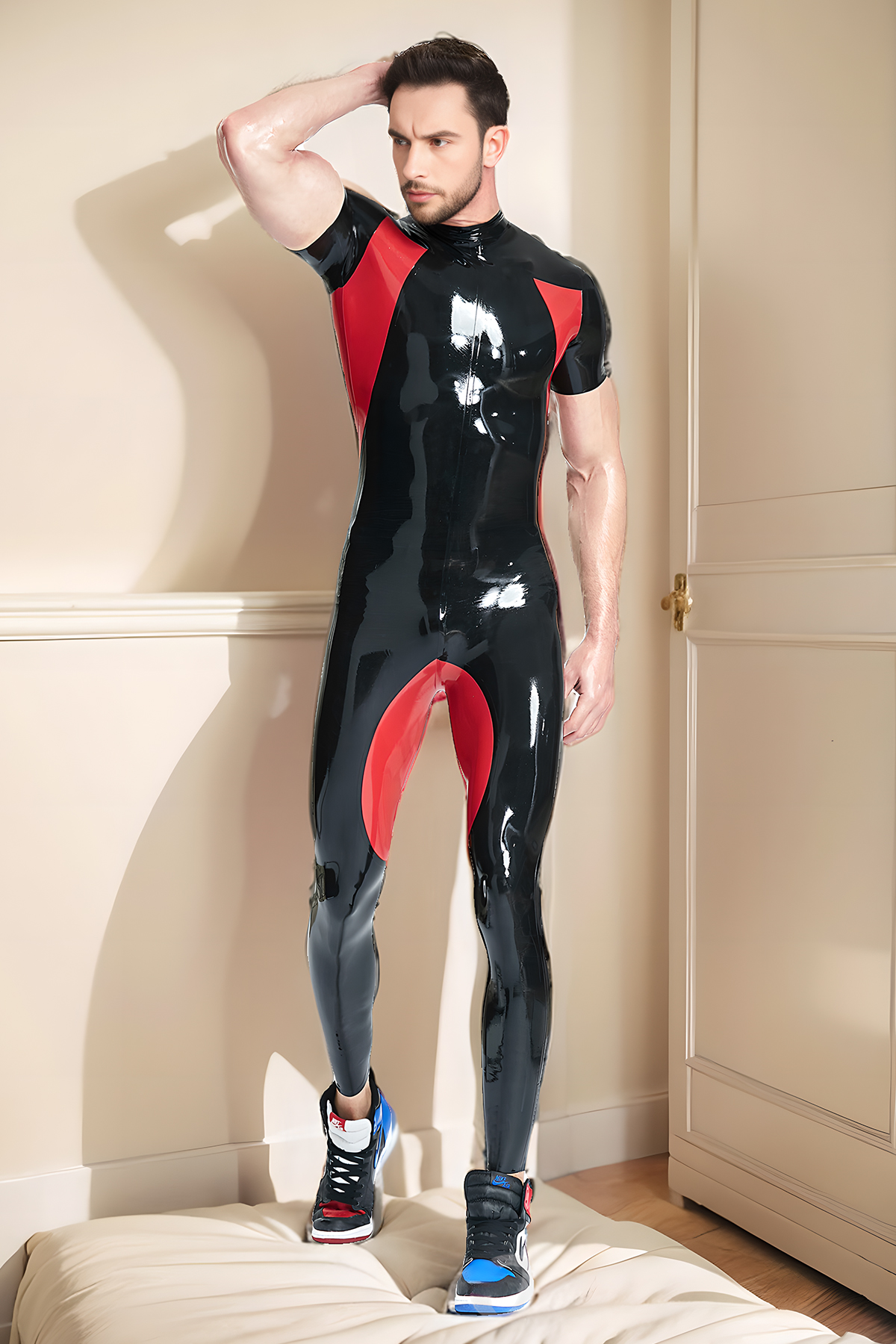 This catsuit is a dynamic and sensual piece, crafted from high-gloss genuine latex that has an extremely high luster and reflects light. The design features a compelling two-tone color scheme of Black and Red. The main body of the suit is Black, while the shoulders, upper arms, and parts of the inner thighs are a bold Red. This combination creates a striking, streamlined splicing pattern that visually enhances muscle lines and contours, giving the catsuit a powerful and athletic feel.