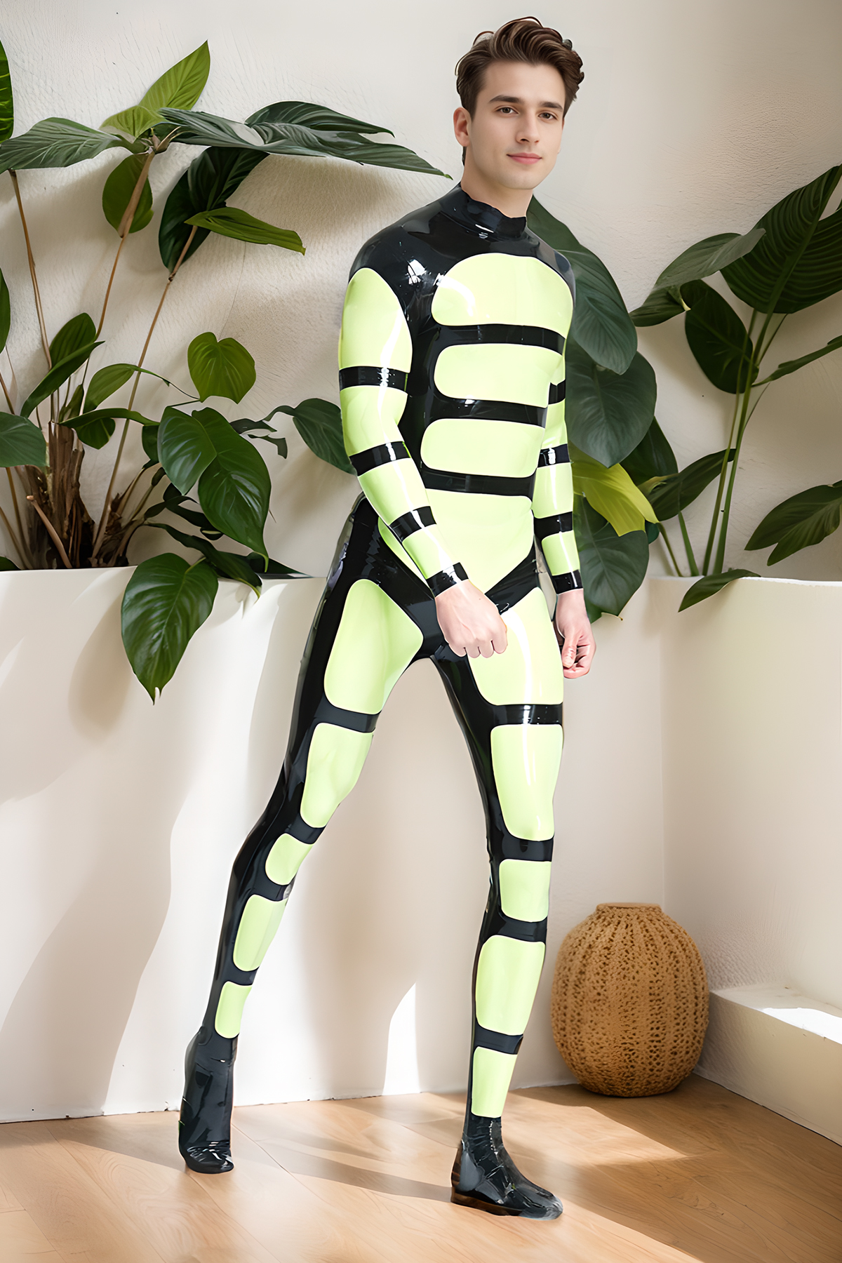 Material and Design: This catsuit is a dynamic and powerful piece crafted from high-gloss genuine latex. The design features a striking Black base with unique Grass Green block patterns on the chest, arms, and legs. These patterns create a visual effect reminiscent of an "exoskeleton" or high-tech armor, giving the suit a futuristic and powerful look. The glossy, reflective material perfectly conforms to the body, emphasizing the wearer's physique and muscle definition.